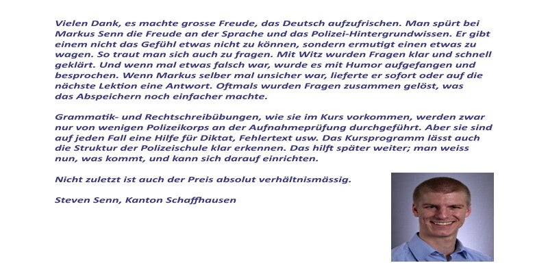 Die Polizeikorps in der Schweiz verlangen von Ihnen als Bewerber(in) ein sehr gutes Deutsch. Viele unterschätzen das. Das Resultat: Sie fallen bei den Aufnahmeprüfungen prompt durch. Das wollen Sie doch nicht, oder? Machen Sie sich deshalb fit und bringen Sie Ihr Deutsch auf Prüfungsniveau! Damit an der Polizei-Aufnahmeprüfung alles klappt!